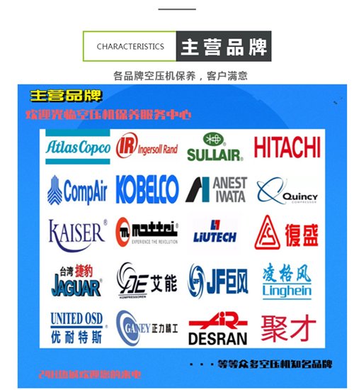 美国英格索兰(INGERSOLL-RAND)、瑞典阿特拉斯(ATLAS COPCO)、美国寿力(SULLAIR)、台湾复盛(FS)、柳州富达(LIUTECH)、上海斯可络(SCR)、英国康普艾(COMPAIE)、日本日立(HITACHI)、神钢(KOBELCO)、德国艾高(ECOAIR)、宝驹(BOGE)、凯撒(KAESER)、汉诺威(HANNOVER)、凌格风(LINGHEIN)、英格索兰(INGERSOLL-RAND)、阿特拉斯(ATLAS COPCO)、博格(BOGE)、向阳(ROTORCOMP)、美国昆西(QUINCY)、正力精工、飞和、优耐特斯、奔威、艾能、聚才、巨风、捷豹、凌格风、开山、台湾复盛、上海浪潮、德斯兰、螺钢、气力王、钛钢、日本岩田、斯可络(SCR)、意大利玛泰、三井