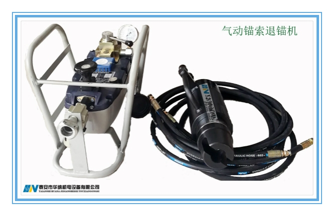 矿用锚索退锚器由退锚千斤顶和 QYB50 气动液压泵及二层钢丝编织液压支架软管 等组成,气动液压泵以压缩空气为动力,可根据要求调整输出压力,构成一组煤矿巷道钢绞线预应力退 锚的必备设备。该机具有同样也适用于使用钢绞线的交通隧道和冶金、化工等矿山工程。