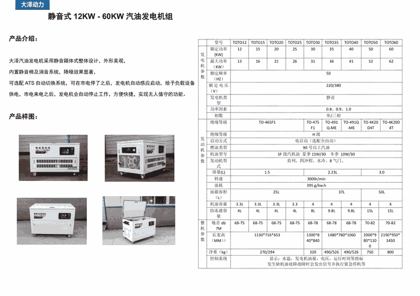 大泽动力静音汽油发电机,可根您的需求定制单相或三相,当然也可以单三相,大泽汽油发电机是箱体式配有四个轮子,方便移动