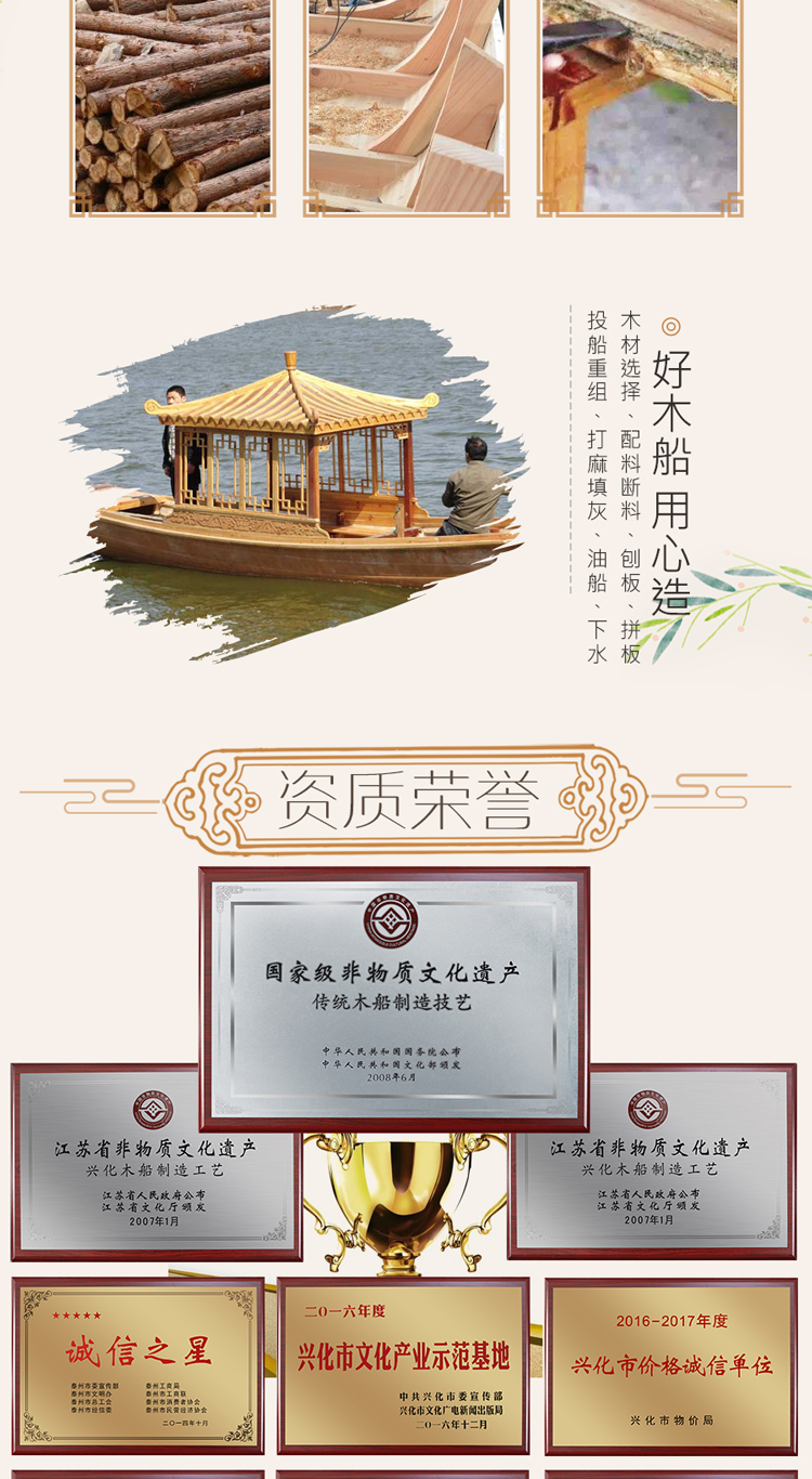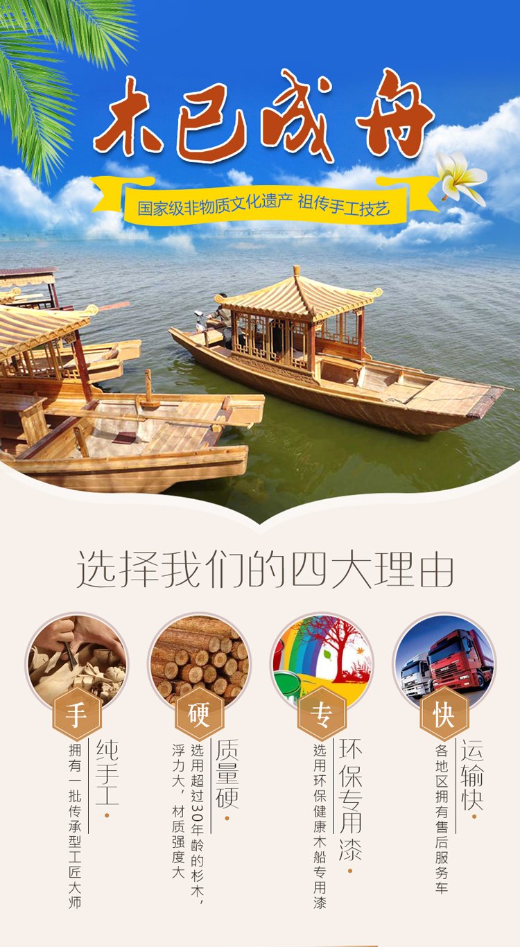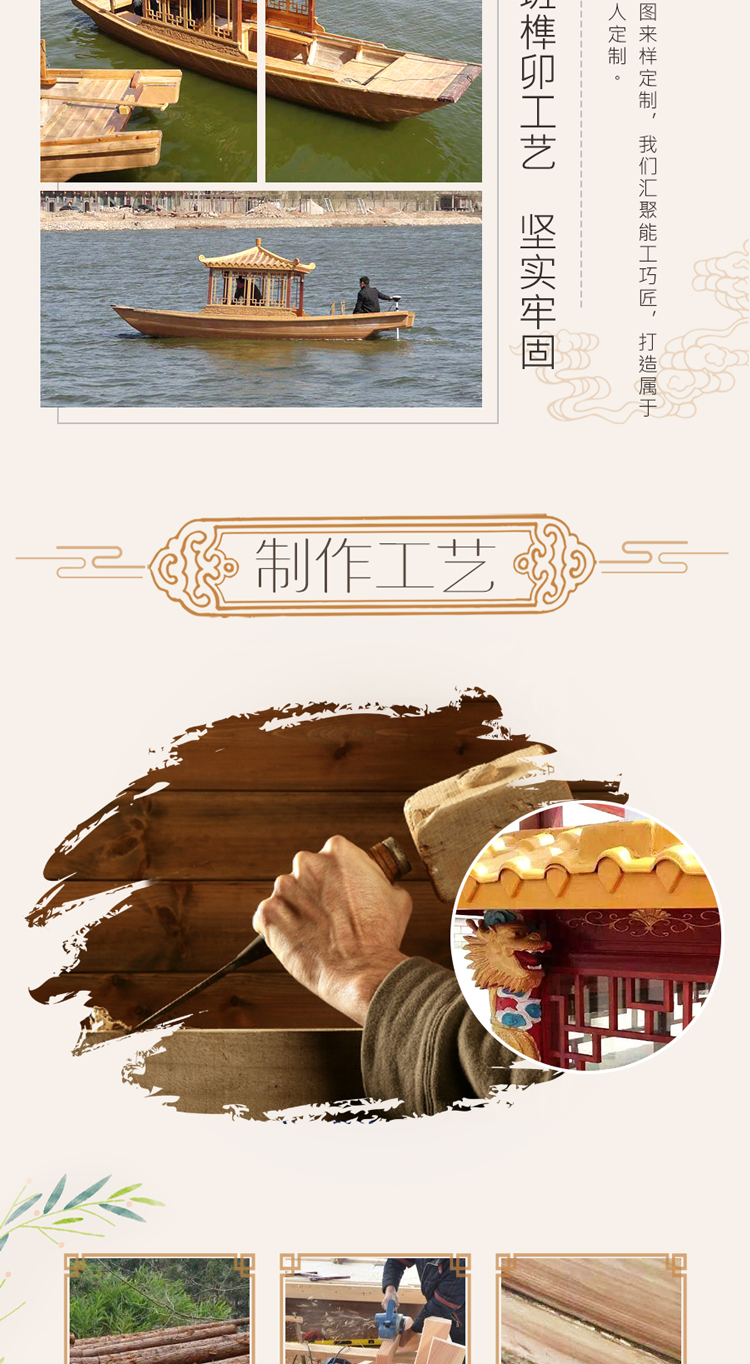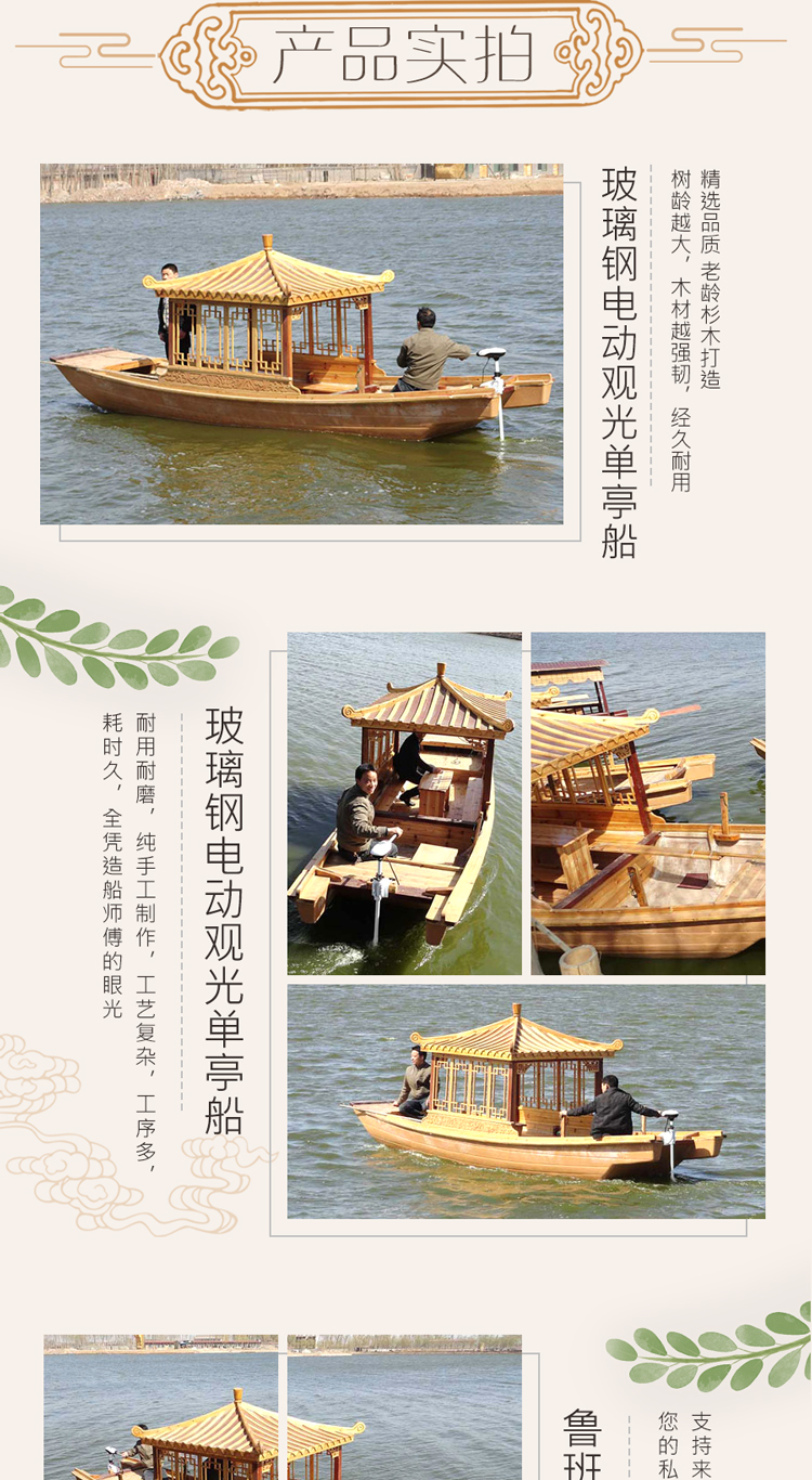周氏木船订制各种仿古旅游观光船电动玻璃钢游船木质单亭船