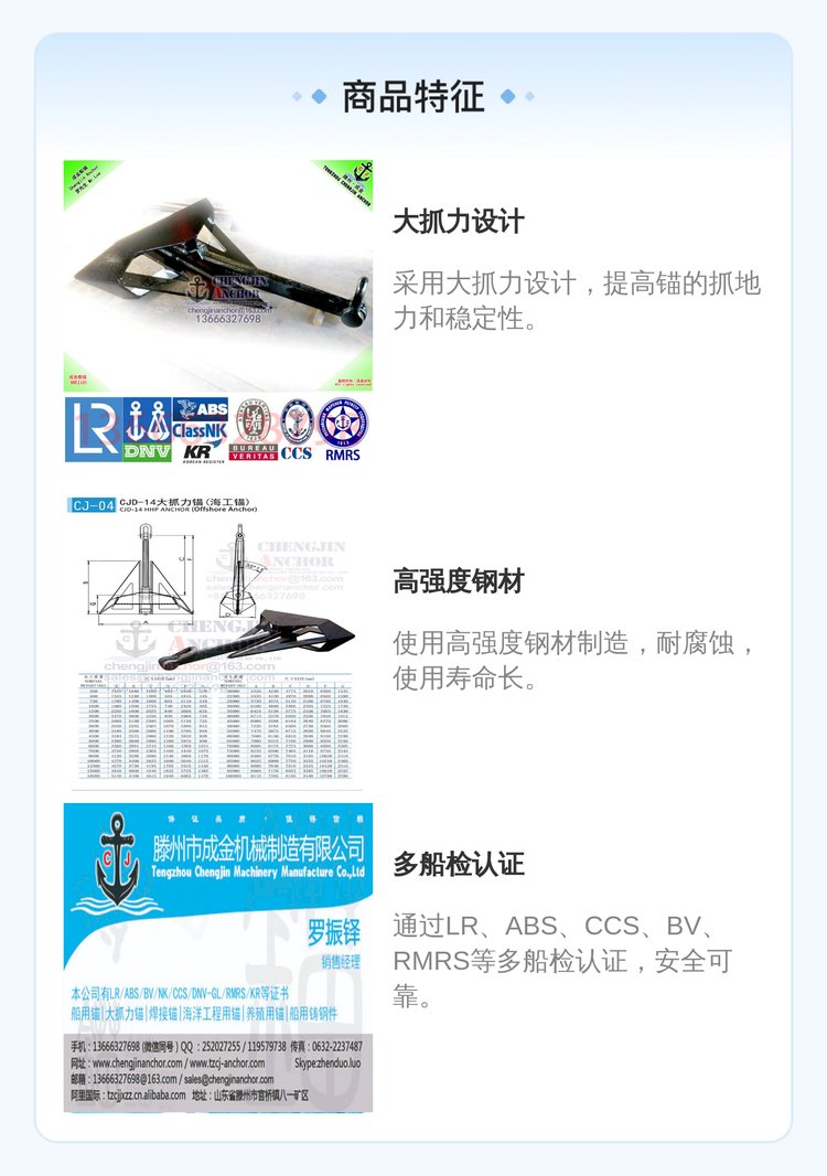 产品特性 | 大抓力,适用于海工平台及多种船型 | ||