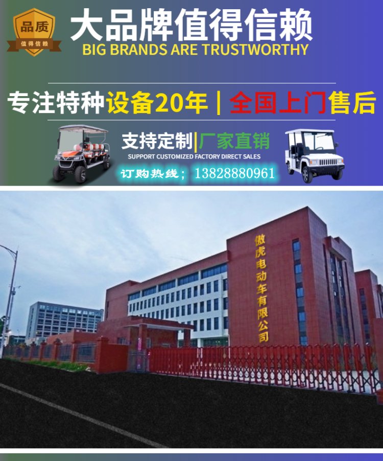 傲虎电动车是国内集研发、生产、销售及服务一体的观光车生产厂家。同时也是从事环保型电动车制造的高新电动车型企业,国家电动车重点制作企业。公司成立于2002年9月29日,其注册资本伍仟万元整,公司占地15000平方。