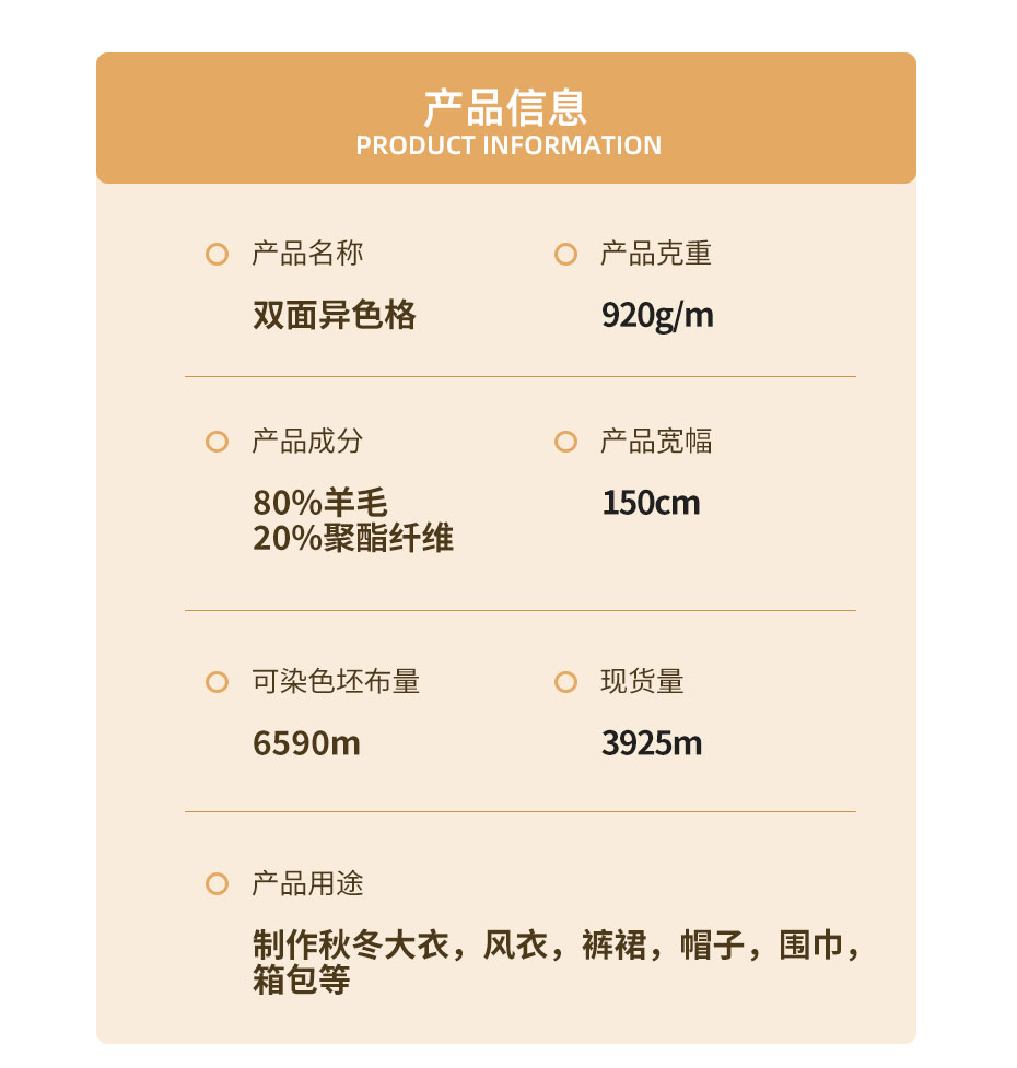 具体用途 | 制作秋冬大衣、风衣、裤裙、帽子、围巾、箱包等 | ||