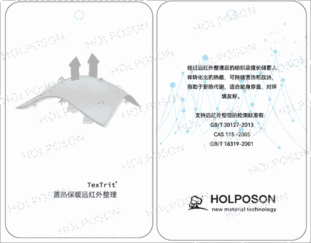 HOLPOSON®Cyclopsman 主要成分为特殊陶瓷粉,可长久贮存。此款产品是由东华大学博士团队开发的纺织品多功能整理剂,本身除了有发射远红线使人体体感上升的功能之外还有利于消臭吸附异味,是多功能整理剂。适合用于棉,粘胶、毛、腈/毛,涤纶,锦纶等各种纤维的后整理。HOLPOSON® Cyclopsman在:家纺、服装、袜子、内衣、手套等领域有广泛应用。