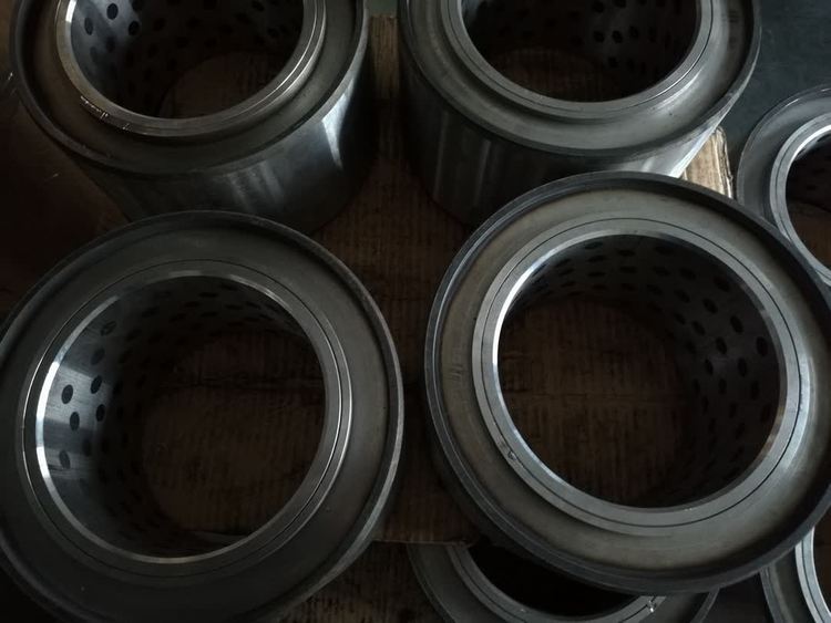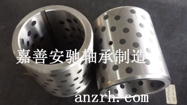 钢基镶嵌轴承:以轴承钢或45钢等各种牌号钢材作为基础材料,根据使用工况按一定比例在其工作面加工出孔穴并填入固体润滑剂,钢基合金提供了很高的承载能力而固体润滑剂则可以形成较低的摩擦副,在高载低速条件下显示出了其优秀的自润滑性能,是固体镶嵌加强型产品,具有极高的抗压性能。在镶嵌石墨工作的时排出润滑颗粒的情况下,使轴与套之间产生一层隔膜,起到比单体油润滑抗咬合的优点。在起重机械的支撑部位尤其适用,适用于冶金机械,烧结机,模具导柱,注塑机模架,卷土机、吊车支撑,翻钢机/冶炼烧结机台车等。
