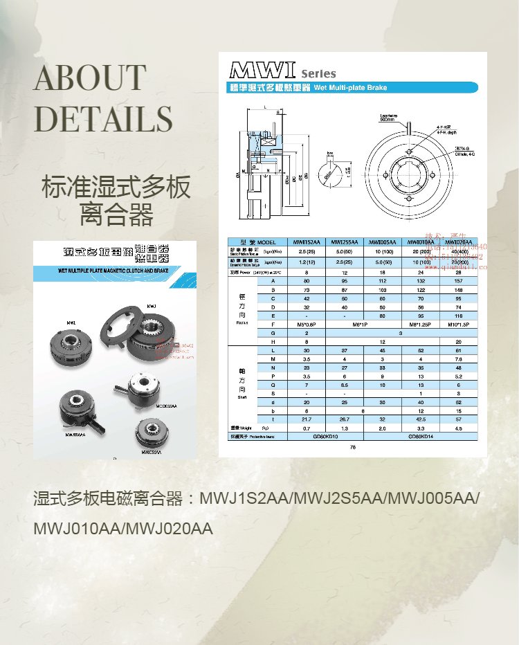 湿式多片电磁离合器,湿式多片电磁制动器主要应用于工作机械(车床,镗床,铣床,多能自动加工机床)、建设机械,锻压机械,搬运机械,木工机械,船舶,特殊车辆(PTO),其他一般产业机械。扭力范围在0.3KGM-20KGM。