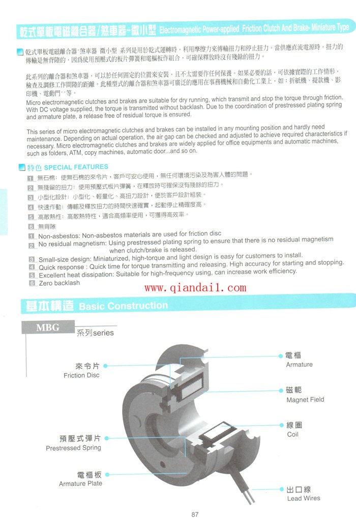 干式单板电磁离合器、刹车器 微小型 系列是用于干式运转时,利用摩擦力来传输扭力和停止扭力。当供应直流电源时,扭力的传输是无间隙的,因为使用预压式的板片弹簧和电枢板作组合,可确保释放时没有残余的扭力。