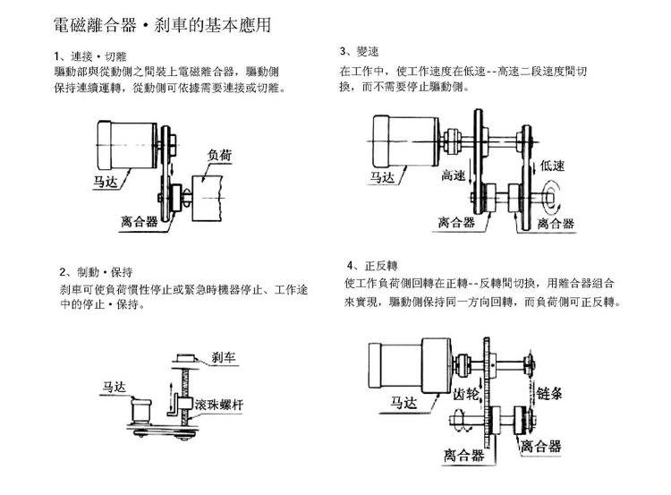 连接与切离动作:驱动部位与起动部位之间安装离合器,则不须停止驱动处,起动处会依必要反应做连接与切离的动作.
