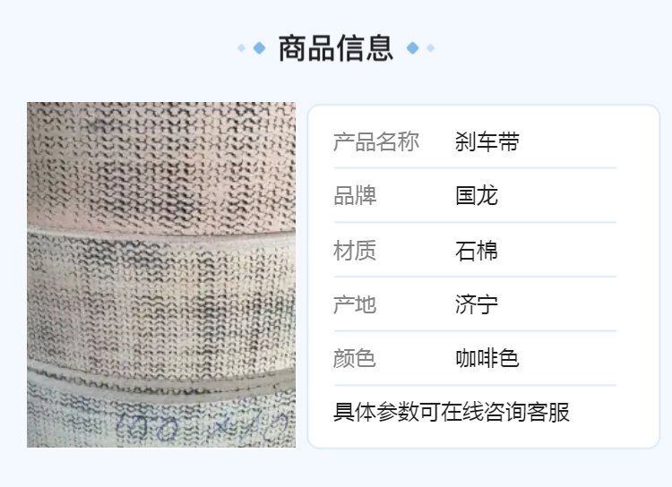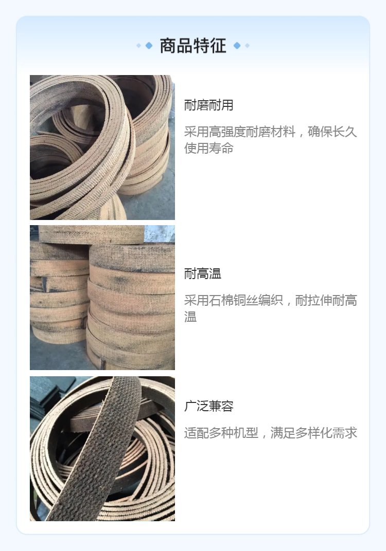 石棉编织型刹车带选用新型耐磨、耐高温非石棉线条,内含黄铜丝、粘胶纤维、玻纤、芳纶纤维等成分。经过先进机械设备整体编织,浸渍特别配制的高分子树脂,经高低温等工艺定型而成。产品摩擦性能好、磨损率低、抗拉强度高、柔软性好、耐高温、耐腐蚀、使用寿命长、具有良好的防冲击性,属环保产品。