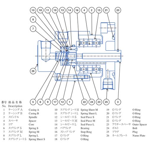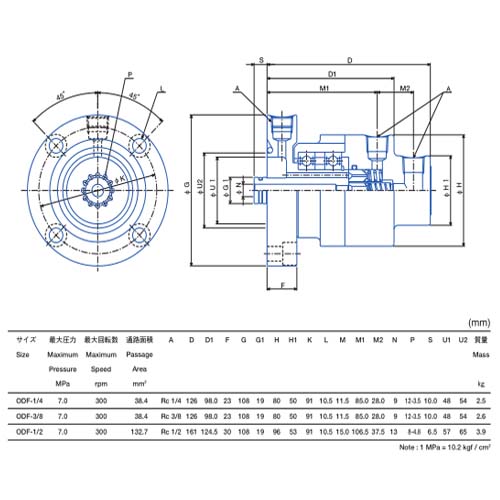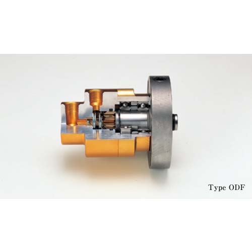 油压用2通路旋转接头是通过轴端部2个独立通路供给流体的。各通路如1方通路是轴承给油用,另1通路是安装于回转轴的执行机构用的话,以各自不同目的进行使用。也作为油循环系统使用。