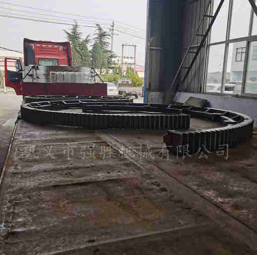 安装在水泥厂回转窑上的大齿轮,统称为回转窑大齿圈。大齿轮根据回转窑的直径大小,按结构方式可以分为:整体式大齿轮、两半式大齿轮、多瓣式大齿轮。按传动齿的类型可以分为:直齿式和斜齿式。