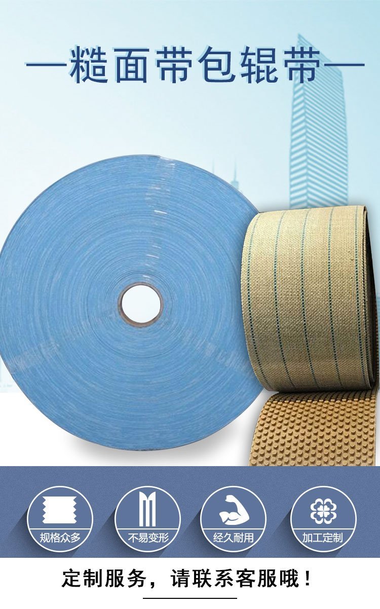 1;纺织印染 造纸印刷 塑料薄膜 食品包装行业导辊用糙面带,糙面橡胶带 进口防滑包辊带,粒面带,罗拉皮,刺皮,包辊带,包辊黑绒带,包辊绿绒带,进口软木带 水松皮 芝麻胶带 耐高温硅胶包辊带…