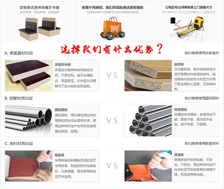 A:我们是专业生产定做餐饮家具的厂家,十分注重产品的细节与结构,并依托强大的产品研发实力,不断创新和努力,致力于为客户提供更优质的产品和更优良的服务。