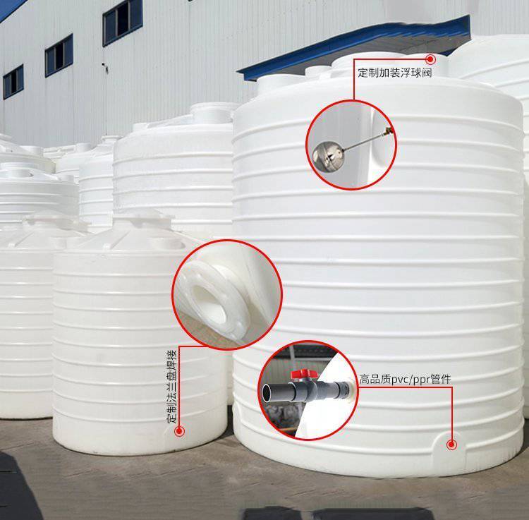 进水口:进水口开在塑料水塔的顶部,当塑料水塔由桶外通过水管进水时,为防止所装液体溢流,在进水管上应安装进水浮球阀,浮球阀数量1-3个(根据水箱的大小安置浮球阀数量