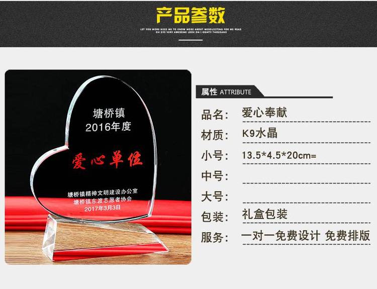 本厂产品 , 品质,工艺精细。绝大部分产品均可按客户要求订做,部分产品都有大中小尺寸,每个款式尺寸不一样,相对的也会不一样;具体请询问客服。所有产品标价均含礼品盒包装。在产品的造型设计过程中,积极融入客户的个性化创作意图,使每一款产品造型都能散发着她 的个性魅力,是客户意图的 体现。秉守“质量、诚信、服务”的原则,产品全部 环保原料,运用 的光学冷加工技术打磨组合,引进高科技的生产设备,采用菲林喷砂、激光内凋、真空镀膜、数码影像、包装印刷等生产工艺精心打造;产品涵盖奖杯、奖牌、礼品、赠品、纪念品、家居饰品等多种类型。