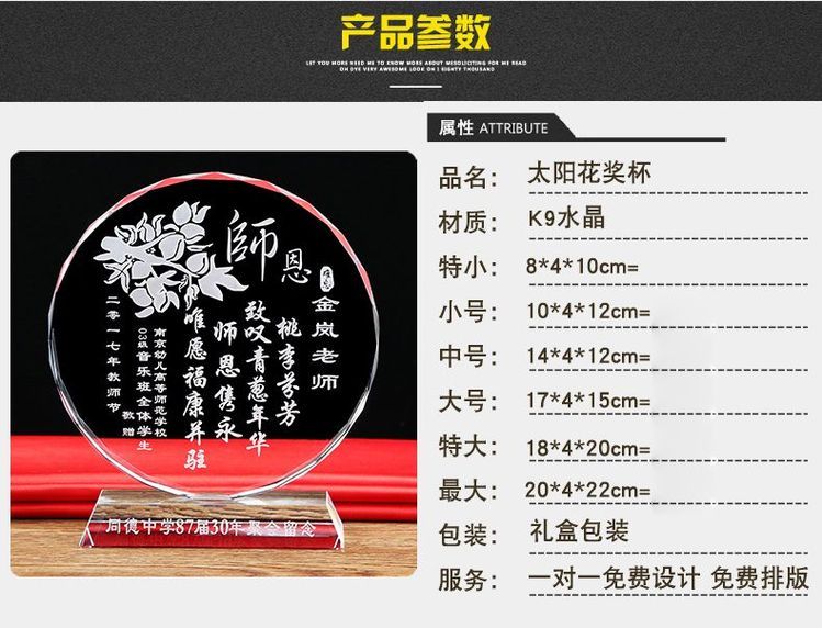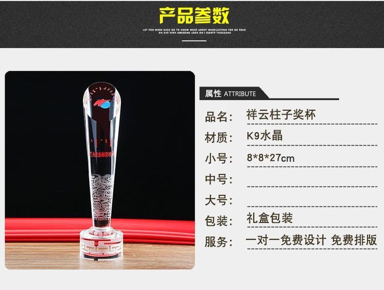 广州腾洪工艺品公司生产的腾洪牌水晶奖杯采用 的K9水晶料经过切割、磨削、抛光等 工艺精制而成。产品款式新颖,设计 ,造形美观,晶莹剔透,集实用和观赏为一体。是各种球类比赛奖杯、各种运动会奖杯、各种销售奖杯 家奖杯、职工技能奖杯、土木工程鲁班奖杯,詹天佑奖杯, 家奖杯,建设纪念奖杯,职员技能奖杯, 单位奖杯, 客户奖杯,杰出贡献奖杯,突出贡献奖杯, 小组奖杯,文明活动奖杯,见义勇为奖杯,季度 奖杯,销售奖杯,技能比赛奖杯,表彰会奖杯杯,评选活动奖杯,展销会奖杯,忠诚员工奖杯,周年纪念奖杯,合作单位奖杯, 团队奖杯、突出贡献奖杯、劳动模范奖杯、荣誉奖杯,周年庆典奖品、等各种奖项用品的选择。?