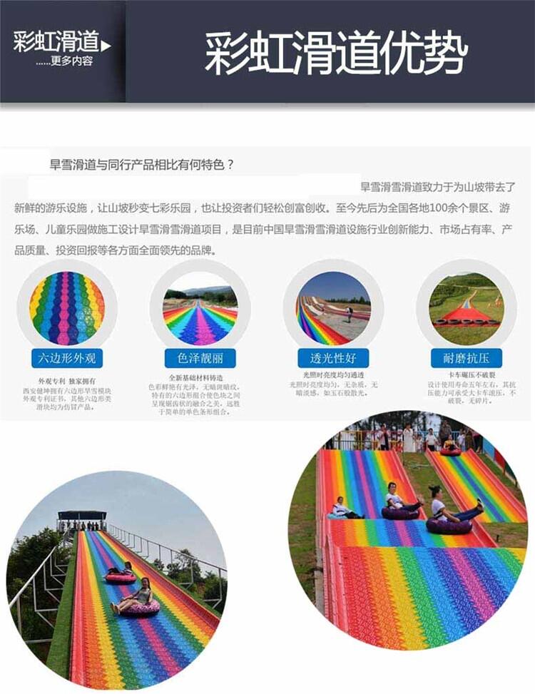 彩虹滑道引入了色彩鲜艳的干雪适应环境在零下40度到零下80度之间,可以位于城市、郊区、陡坡、风景区、操场等。成功打破了季节和地域的限制。满足四季滑雪的操作需求。也给许多滑雪场、水上公园和严格的自然温度场和项目提供了更多的选择,成为一个新的走向旅游、休闲和游乐的项目(许多滑雪场也通过引入干旱成功地锁定了游客对滑雪的注意力,提高了场地的使用效率,也可以使游乐设备得到利用。