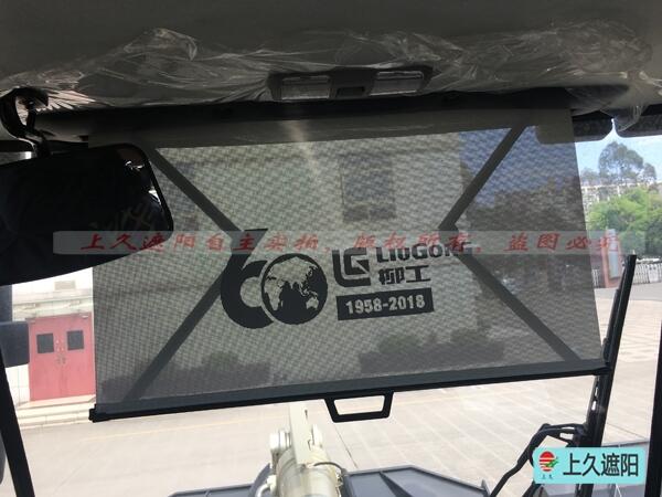 自锁式结构遮阳帘,内置弹簧自锁功能,下拉过程中缓慢放手可以锁位,锁位固定后下拉可自动回收,配导杆支撑,确保窗帘的稳定无晃动。采用网孔帘布接PU革面料,印制柳工LOGO。
