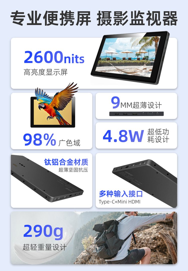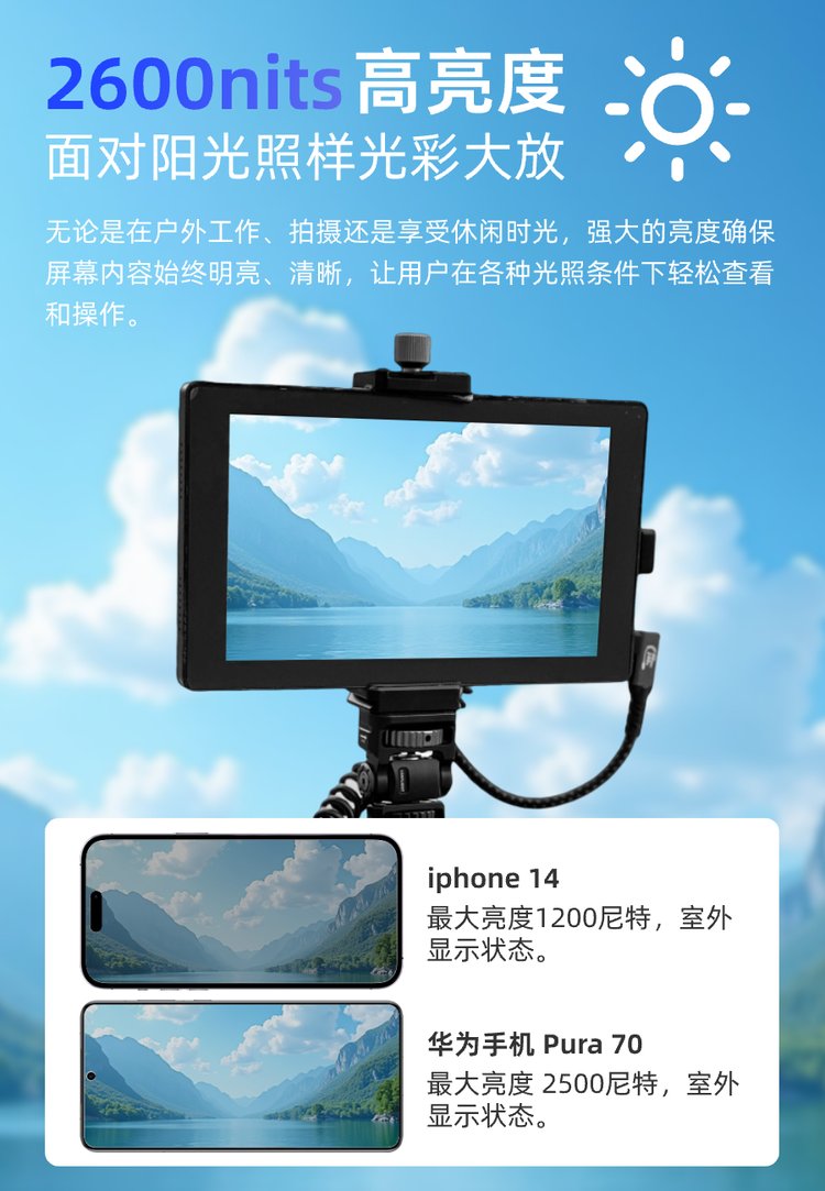 显示器 | 7英寸 1920*1080 FHD分辨率 2600nits 高亮高色域 (NTSC 98) | ||