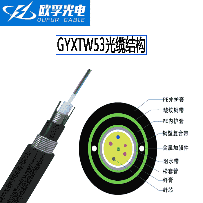 中心管式光缆:光缆中心为松套管,加强构件位于松套管周围的光缆结构型式,如的GYXTW53型光缆,光缆芯数较小,通常为12芯以下。