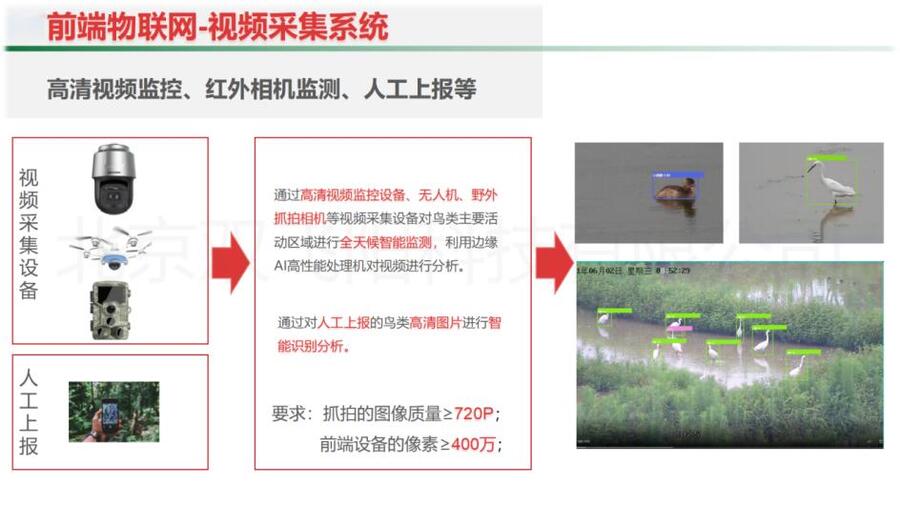 运用AI智能识别和AI边缘计算服务,通过高清摄像机、红外相机、声纹信息采集设备等对鸟类进行自动巡航监测,结合