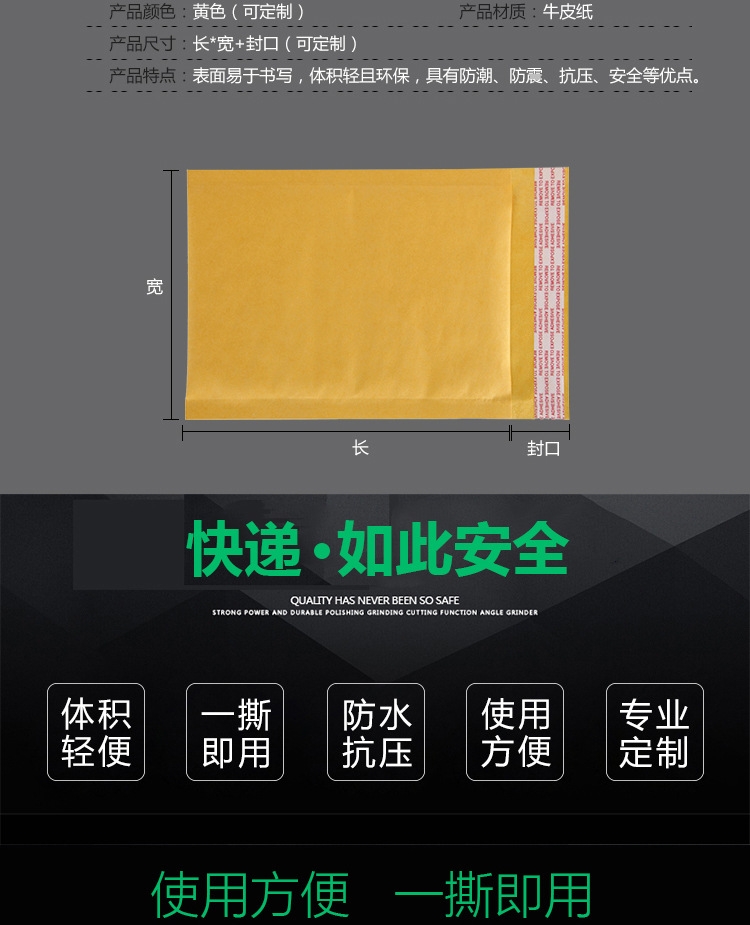 外层采用优质牛皮纸(用于填写地址、增加包装强度),内层使用弹性气泡膜(防湿、抗压、抗震),保护被邮寄物品的安全,防止物品在邮寄过程中因压、碰、跌落而损坏。产品具有防震、防压、防潮、重量轻、使用安全方便、适应性强等特点,是替代小木箱、小纸箱的理想新一代邮件包装品。