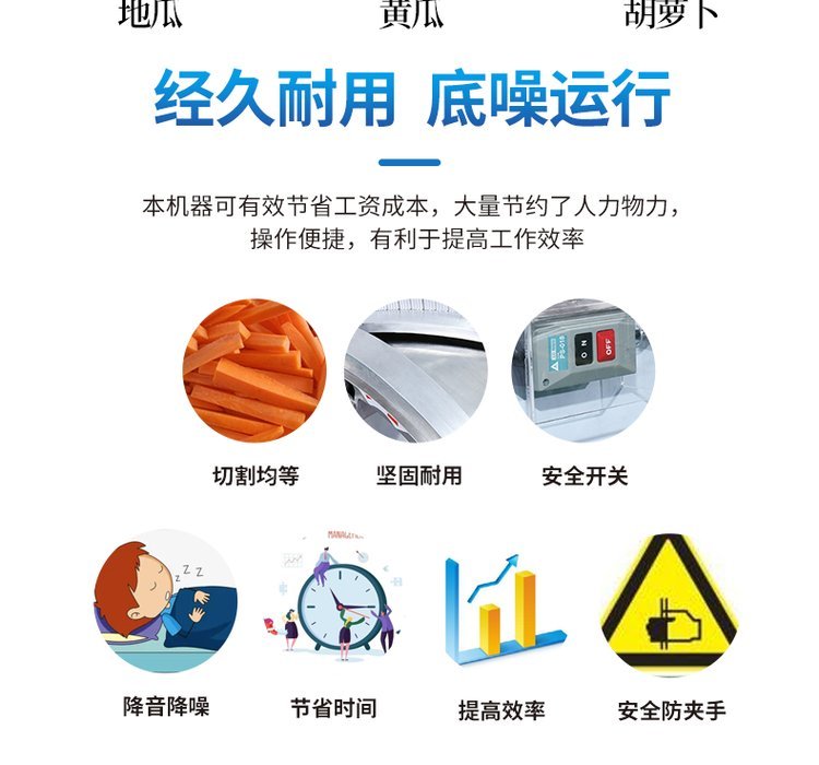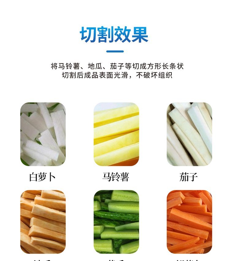 产品用途 | 将土豆地瓜萝卜等切成方形长条状或片状 | ||