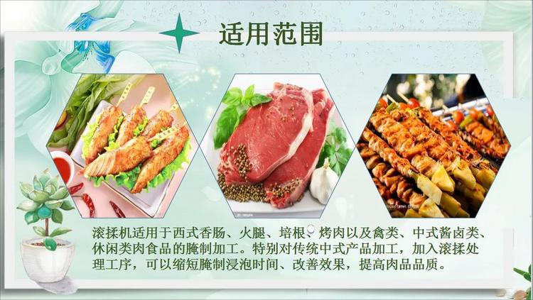 用途 | 排骨鸡鸭牛肉等一起滚揉腌制 | ||