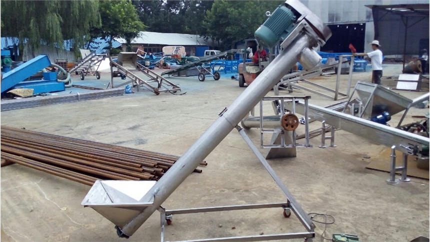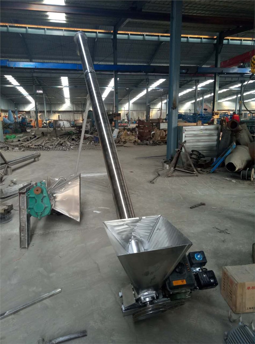 不锈钢螺旋提升机工作时旋转的螺旋叶片将物料推移而进行输送,使物料不与螺旋提升机叶片一起旋转的力是物料自身重量和螺旋提升机机壳对物料的摩擦阻力。螺旋提升机旋转轴上焊有螺旋叶片,叶片的面型根据输送物料的不同有实体面型、带式面型、叶片面型等型式。螺旋提升机的螺旋轴在物料运动方向的终端有止推轴承,,不锈钢管式螺旋上料机,在螺旋管较长时,应加中间吊挂轴承。