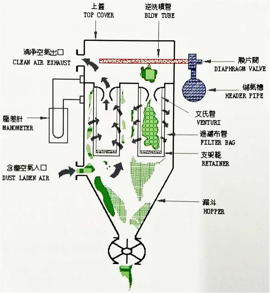 (2)粉尘被滤袋阻隔,滤室内设有许多过滤器材。