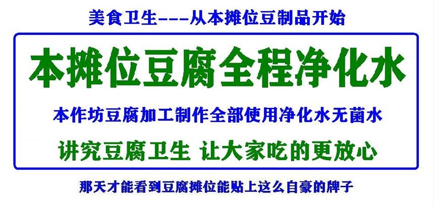 俗话说豆腐是水做的、虽然有点夸张了但是水的含量是不容至疑的、自然豆腐大部分是水的成分、那就得考虑水的质量了、从黄豆用水泡到磨浆再到浆渣分离又到煮豆浆这一系列的过程都离不开水,那就得出了水的重要性、就得讲究讲究了、比如用自来水加工豆腐适当的好那么一点点、用井水加工或用河水加工豆腐就得考虑净化软化一下了,毕竟是大众喜欢的食品、用净化过的水加工出来的豆腐直接就可以标上纯净化水生产的豆腐、大众不就更放心了吗。