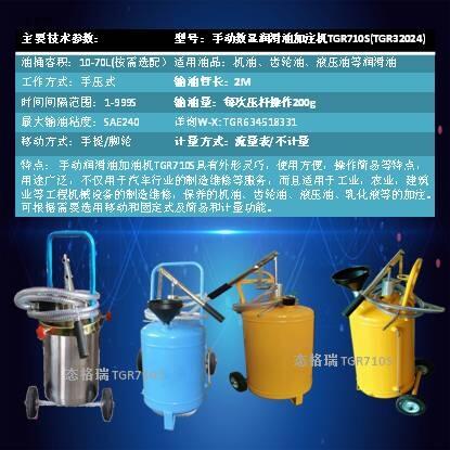 手动计量润滑油加注机TGR32024移动式齿轮油注油器TGR710S具有外形灵巧,使用方便,操作简易等特点,用途广泛,不仅用于汽车行业的制造维修等服务,而且适用于工业,农业,建筑业等工程机械设备的制造维修,保养的机油、齿轮油、液压油、乳化液等的加注。