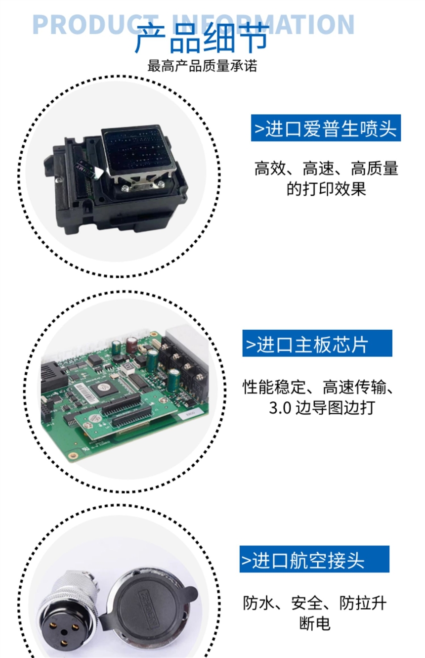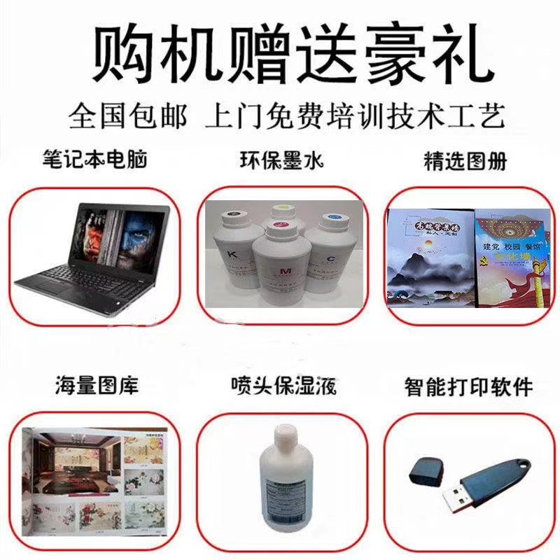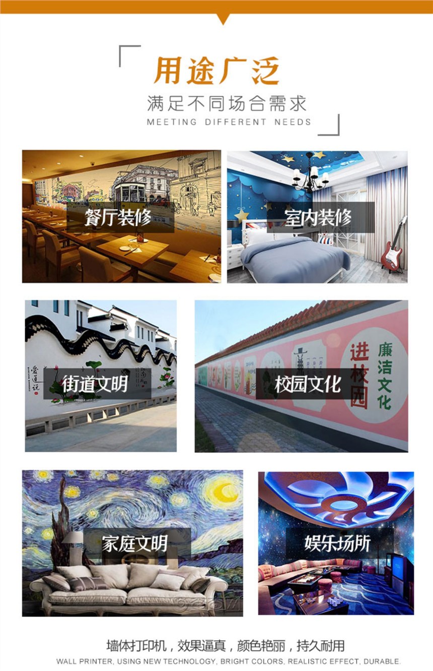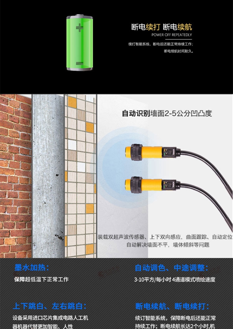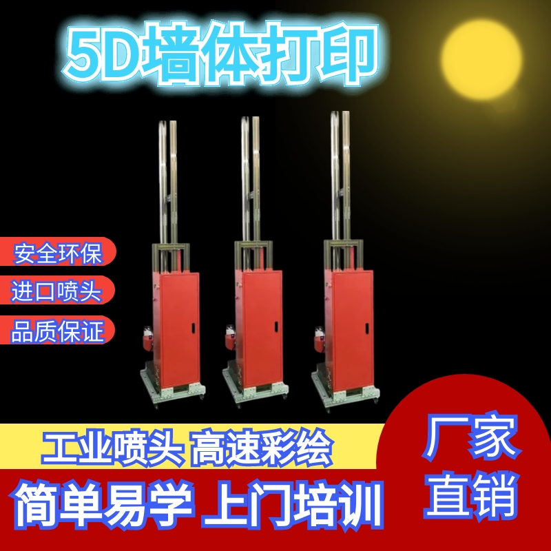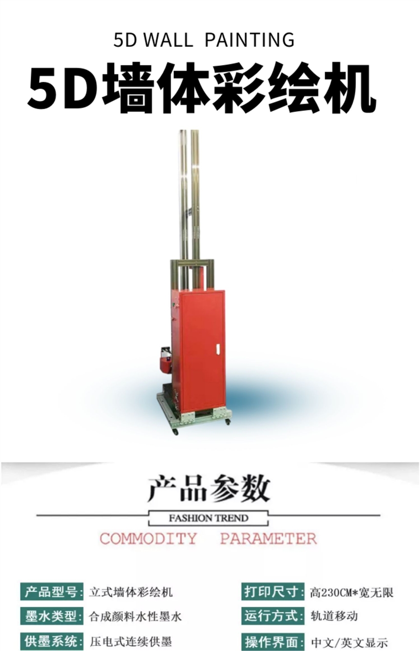 墙体打印机,近几年流行火爆的创业机型,价格实惠,投入产出比高,是创业人员爱选择的一个项目,适用性强,操作简单,适合户外墙体打印喷绘、室内墙体彩绘喷印,一次成像、色彩亮丽,不褪色,采用绿色健康环保型墨水,成本低廉,可接触任何材质墙体打印,效果好。智能升级型、微电脑控制、 PVC 操作面板,菜单式界面、液晶显示, X 轴 采用进口直线导轨,增设匀速缓冲程序、自动锁定程序、任意位置定位程序、运行更平稳,精度更高。 Y 轴 采用进口双轴心轨道、无障碍滚轮滑块,设置记忆程序,自动锁定高度运行更平稳、更顺畅。 Z 轴采用美国原装测控传感器,实现对凹凸墙面、快速自动追踪,轻松解决墙面不平、墙体倾斜、凹凸等问题,让施工更省心,更安全,更有效。 采用进口八色(四色)爱普生高清压电喷头,使用油性墨水 ,喷墨更顺畅,速度更快捷,着色更细腻、更鲜明,更清晰。配备喷头自动清洗装置,无须拆卸,自动完成,有力保障墨路畅通,喷头采用自动防护装置,大大降低喷头受外部环境的影响带来的风险。全封闭式连续供墨系统,保证墨管无负压,墨水供应的连续性,防止灰尘进入墨管和喷头,延长喷头使用寿命,以便更加适用于户外环境。智能升降平台,根据不同墙面高度,任意调节机器高度。